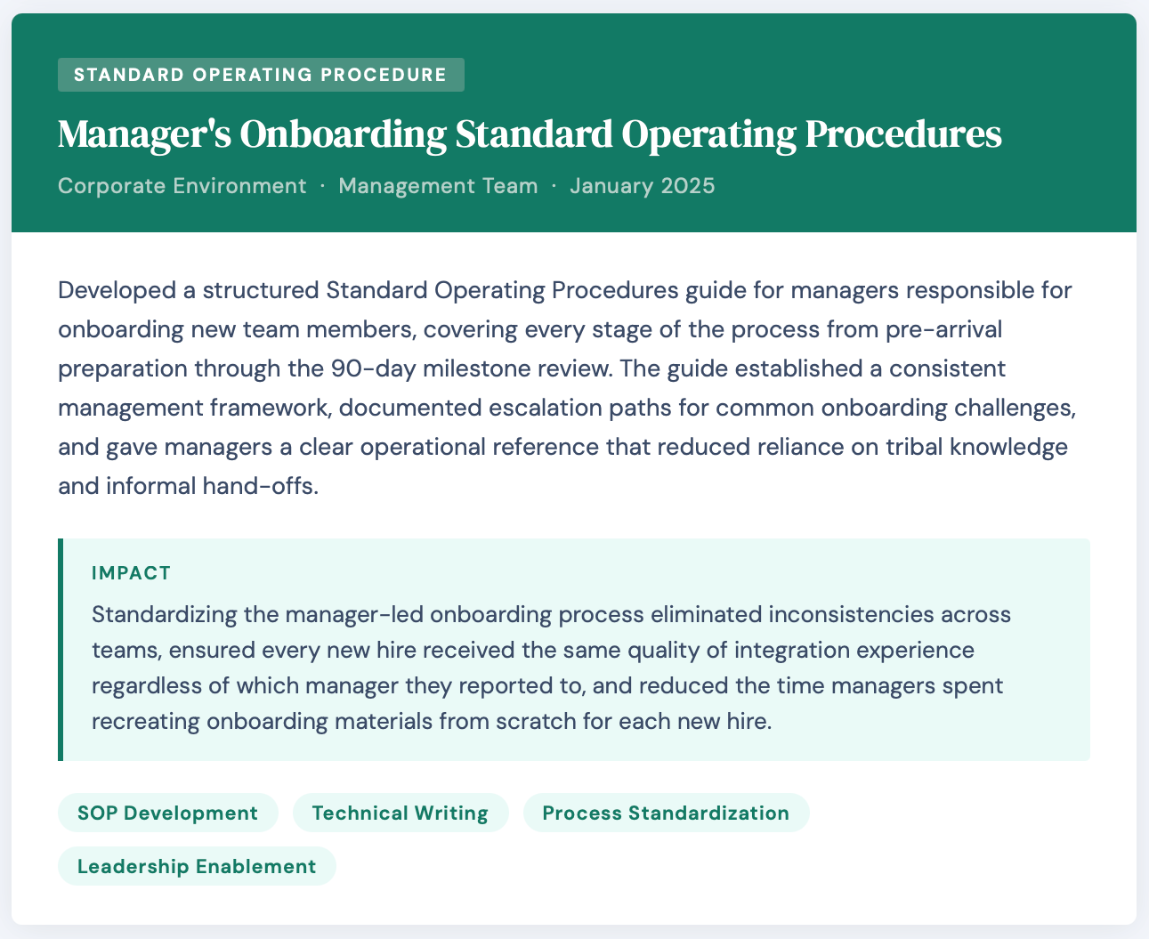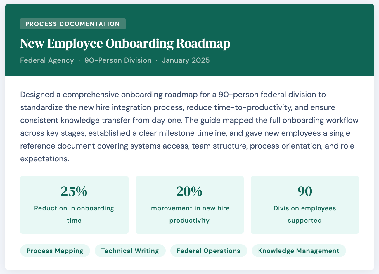 Process documentation and standard operating procedures developed across federal and corporate environments, demonstrating technical writing, workflow design, and operational standardization.